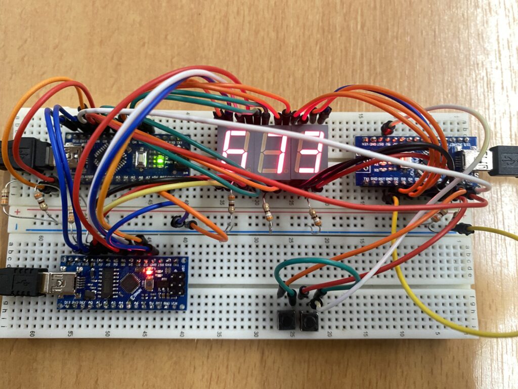 Anfangs gab es nur ein Displaymodul. Daher konnte man nur die Zahlen von 0-9 darstellen, allerdings wollte ich mehr anzeigen. Das Problem ist aber, eine 7-Segment-Anzeige braucht 7 Pins. Ein Arduino hat aber nur 13, also einen zu wenig um zwei Displays anzuschließen. Also musste ein zweiter Arduino her. Um noch mehr Zahlen anzuzeigen kam dann der Dritte.